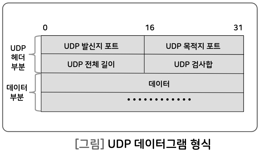 (= 헤더 길이 + 데이터 길이) - UDP 검사합 (16 비트) : 데이터그램 전체의 오류 검사용