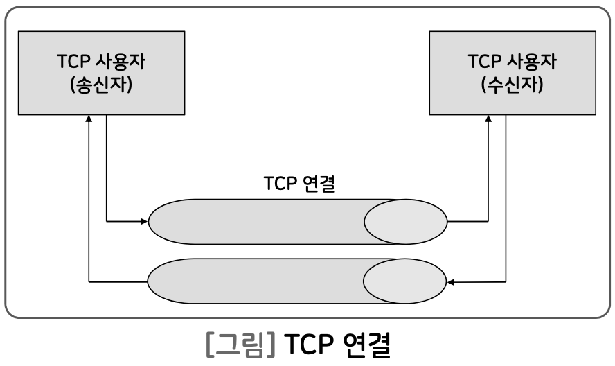- TCP는 신뢰성이 있는 연결형(connection-oriented) 데이터 전송 서비스를 제공하여 발신지 호스트의 프로세스와 목적지 호스트의 프로세스 사이에 연결(connection)이라는 논리적인 관계를 설정하고 목적지로 전송할 데이터 전송에 알맞는 최대 세그먼트 크기로 절단하여 전송