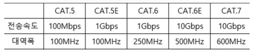 - 100 BASE-TX : 주로 성형 LAN; CAT.5 UTP (최대 100m)