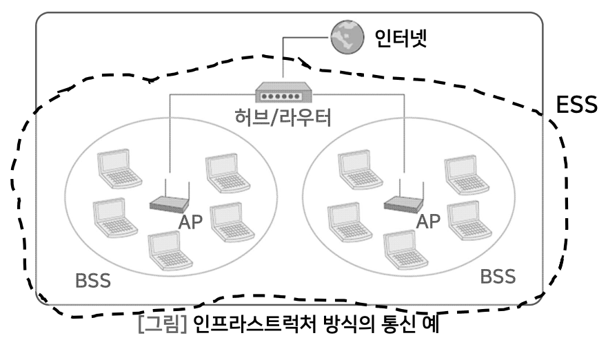 무선 LAN의 인프라스트럭쳐(infrastructure) 통신 방식에서 하나의 AP(Access Point)를 통해 구성되는 무선 LAN- 인프라스트럭쳐 통신 방식이란 무선 LAN 카드를 장착한 노드들이 허브나 라우터에 연결된 AP를 통해서 서로 통신하는 방식