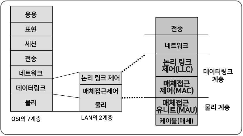- LAN 참조 모델은 OSI 참조 모델의 데이터링크 계층을 두 노드 간에 오류제어와 흐름제어를 통한 데이터 프레임 전송 기능을 담당하는 LCC(Logical Link Control)와 충돌을 피하기 위한 공유 매체 접근 제어 기능을 담당하는 MAC (Medium Access Control)으로 세분화 함