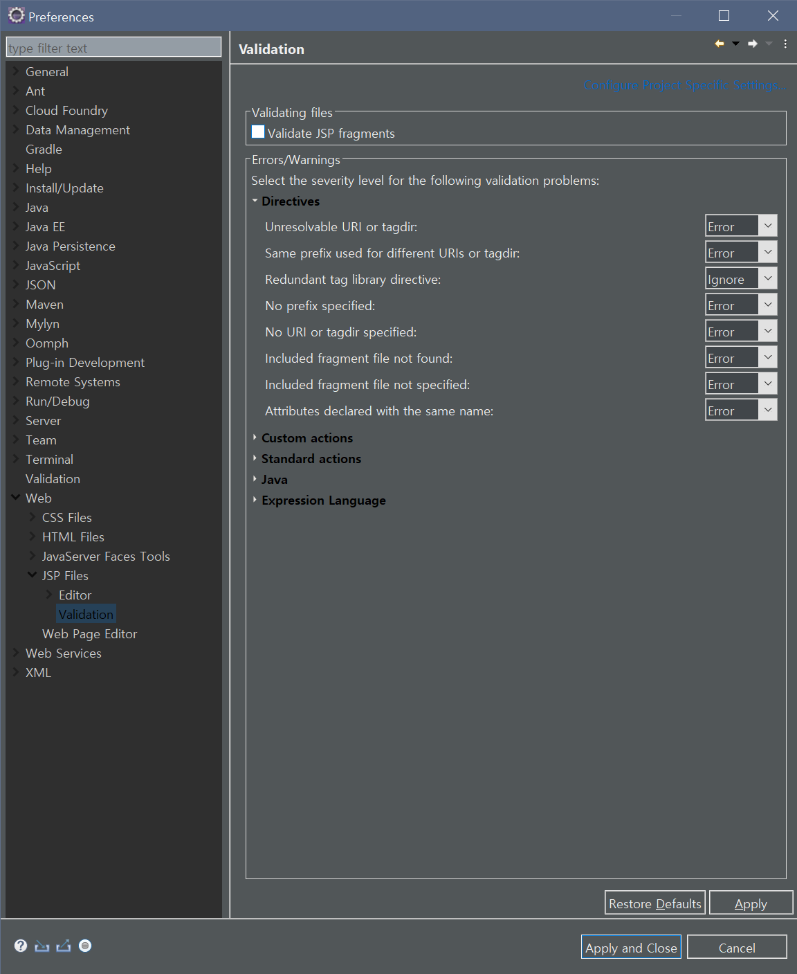 Windows > Preferences > Web > JSP Files > Validation > Validate JSP Fragments체크 해제.