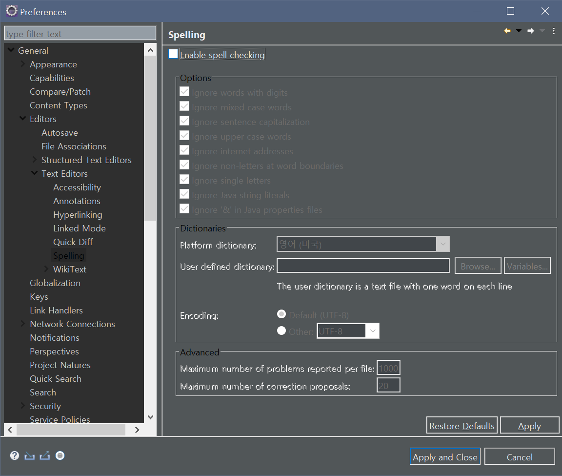 Windows > Preference > General > Editors> Text Editors > Spelling > Enable Spell Checking체크 해제.