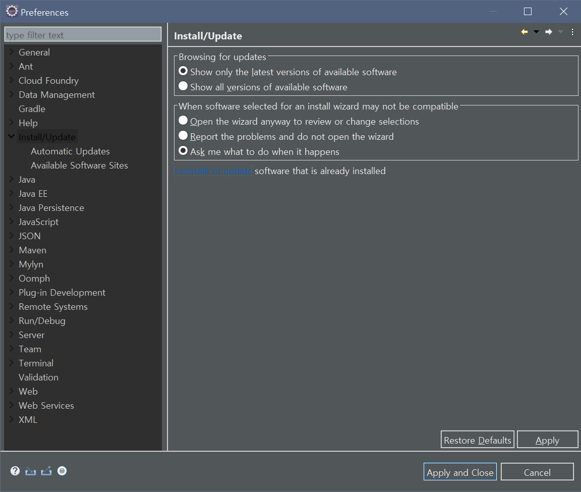 Windows > Preferences > Install/UpdateUninstall or Update창 열어서 불필요한 플러그인 삭제.