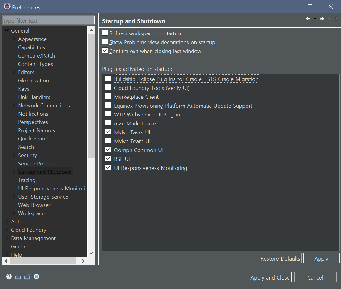 Windows > Preferences > General> Startup and Shutdown에서 디폴트 플러그인 중 불필요한 플러그인 체크 해제.