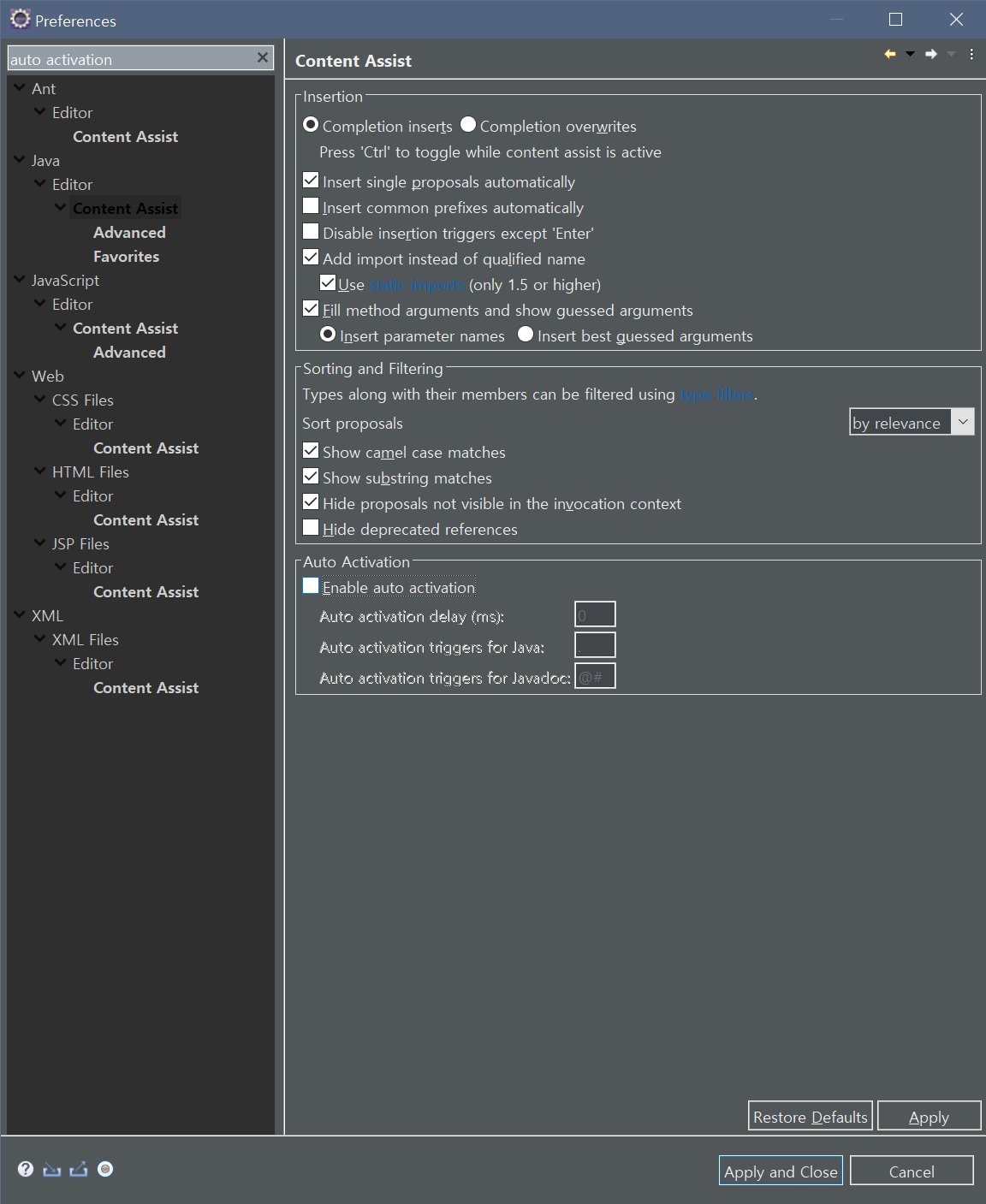 Windows > Preferences > Java > Editor > Content Assist - Auto Activation - Enable Auto Activation체크 해제.Windows > Preferences > JavaScript > Editor > Content Assist - Auto Activation - Enable Auto Activation체크 해제.Windows > Preferences > HTML > Editor > Content Assist - Auto Activation - Enable Auto Activation체크 해제.Windows > Preferences > XML > Editor > Content Assist - Auto Activation - Enable Auto Activation체크 해제.