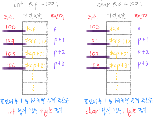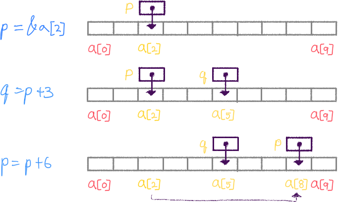 포인터가 선언 되어있을 때 포인터와 포인터와 끼리의 계산이 가능하다.