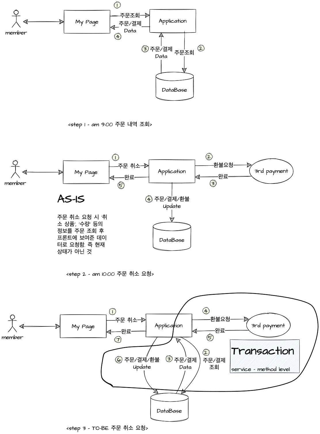 개선 프로세스는 <step 3> 와 같이 사용자 요청을 받고 현재 주문과 환불 진행상태 등을 DB에서 조회하는 ② 부터 완료된 주문/결제/환불 정보를 DB에 업데이트하는 ⑥ 까지를 하나의 트랜잭션으로 묶는다.