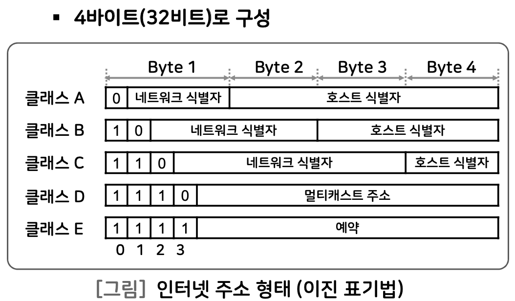 인터넷 주소는 32비트로 구성되며 클래스 A, B, C, D, E로 나눈다. - IP(Internet Protocol)는 TCP/IP의 인터넷 계층에서 동작하고, 네트워크 계층의 투명성을 제공함으로써