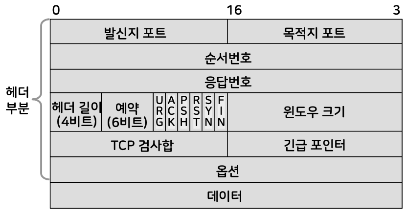 흐름 제어를 위한 윈도우의 크기를 명시 (최대 크기 = 2 ^ 16 [= 65,535 바이트]) - 검사 합 (checksum; 2 bytes) : 오류 제어를 위한 검사합 부분