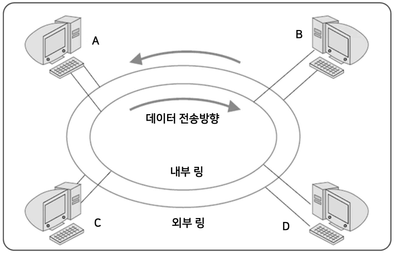 - 2 개의 링이 token passing 방식으로 운용