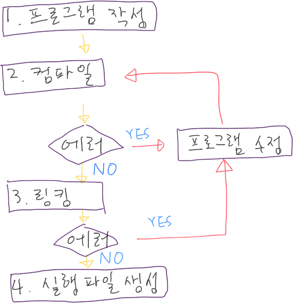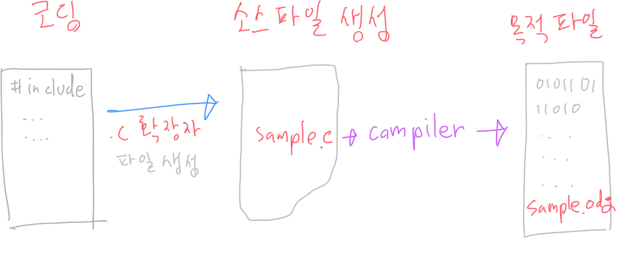 - 소스파일이 목적파일(object file)로 변환되는 과정.
