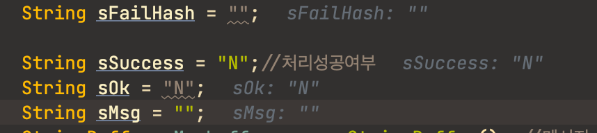 - 변수명과 주석이 일치하지 않거나 주석의 뜻을 담아내기에 부족한 변수명이 많음